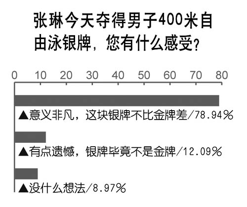 同時(shí),公眾高度評(píng)價(jià)張琳奪得男子400米自由泳銀牌。78.9%的人認(rèn)為這塊銀牌“意義非凡,不比金牌差”。只有12.1%的人表示“有點(diǎn)遺憾,銀牌畢竟不是金牌”,另有9.0%的人表示“沒什么想法”。