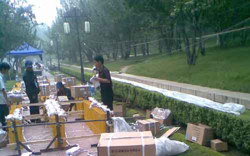 8月8號,早6時30分,負責安裝煙花的工人來到了現場,開始對煙花進行安裝調試。在安裝調試的過程中,出現了一個問題,由于現場有很多樹,部分樹枝可能會阻擋煙花發(fā)現的路徑,導致煙花不能正常發(fā)射,甚至造成火災。為了防止這種事故的發(fā)生,消防官兵對發(fā)射炮一一的做了檢查,認真計算其發(fā)現的軌道,盡量避免在發(fā)射軌道中出現樹枝等阻擋物。如果遇到實在不能避免的樹枝,即迅速與當地相關人員聯系,給與解決。通過大家的統(tǒng)統(tǒng)努力,所有的煙花在8月8號上午11點50分完成了安裝調試。到這時,消防官兵已經連續(xù)工作了15個小時,但是消防官兵知道現在還不能休息,只有到煙花綻放在空中那一刻,才能真正地放下心來。