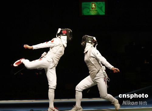 8月11日,北京奧運會女子花劍個人1/16決賽在北京國際會議中心擊劍館舉行,中國選手蘇婉文(左)以15:7戰(zhàn)勝美國選手埃米莉·克羅斯,成功晉級。圖為 雙方在場上拼殺的動作頗似芭蕾舞蹈。中新社發(fā) 盛佳鵬 攝