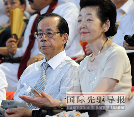 8月8日,福田康夫和夫人在北京奧運(yùn)會開幕式上。記者 黃敬文/攝