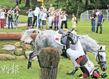 奧運(yùn)馬術(shù)三項(xiàng)賽的越野障礙賽11日早8時(shí)在上水雙魚河舉行,吸引近1萬名觀眾入場。其中,中國首名參加奧馬的18歲選手華天,在日前盛裝舞步賽環(huán)節(jié)中排名31,成績緊隨三項(xiàng)賽六朝元老托德之后。但11日越野賽中,華天跨越于8號“雨花臺”障礙欄時(shí),他策騎的馬“武松”前腳碰到障礙物,馬失前蹄,華天被拋落地面。