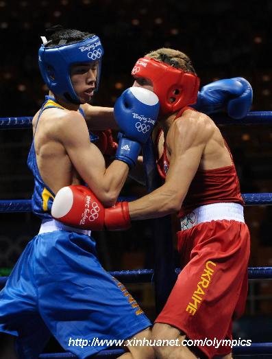8月11日,中國選手胡青(藍(lán))在拳擊男子輕量級(jí)60公斤級(jí)比賽中戰(zhàn)勝烏克蘭選手亞歷山大·克柳奇科,順利晉級(jí)下一輪。這是雙方選手在比賽中。新華社記者陳燮攝