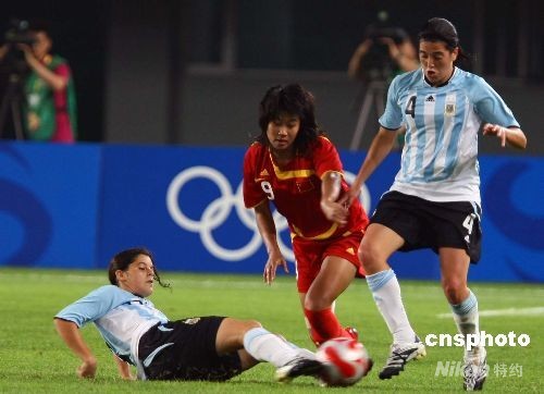 8月12日晚,奧運(yùn)女足小組賽第三輪賽事展開(kāi),中國(guó)女足對(duì)陣阿根廷隊(duì)。第50分鐘,中國(guó)隊(duì)右路起球,阿根廷門(mén)將出擊失誤沒(méi)摘到球,韓端與對(duì)方防守球員碰撞中把球打進(jìn)了球門(mén)。中新社發(fā) 劉新 攝