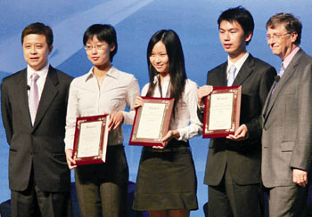 比爾蓋茨與學(xué)生合影。(圖片來源:文匯報(bào))