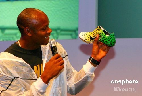 8月12日夜,世界短跑名將鮑威爾在北京發(fā)布強力短跑釘鞋,鮑威爾本人參與該跑鞋的設(shè)計過程。圖為他在展示該跑鞋。中新社發(fā) 沈晨 攝