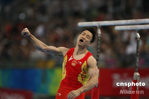 8月14日,中國奧運(yùn)“三朝元老”楊威在北京奧運(yùn)會體操男子個人全能決賽中力壓群雄,以94.575分,高出亞軍2.6分的較大優(yōu)勢,奪得這塊體操個人項(xiàng)目中分量最重的金牌,他也成為繼李小雙之后中國體操的第二位個人全能奧運(yùn)冠軍。中新社發(fā) 武仲林 攝