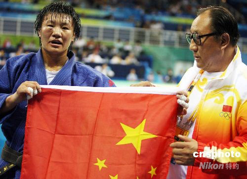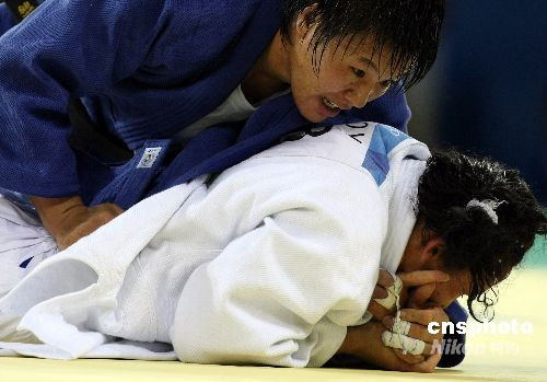 8月14日晚,中國女子柔道名將楊秀麗(藍(lán))在北京奧運會女子柔道78公斤級決賽中擊敗古巴名將亞倫妮斯·卡斯蒂略獲得金牌。中新社發(fā) 任晨鳴 攝