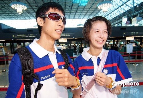 8月15日,中華臺(tái)北跆拳道選手朱木炎(左)、楊淑君飛赴北京參加奧運(yùn)比賽,兩人在機(jī)場(chǎng)都秀出日前求來的佛珠,希望一路平安、比賽順利。中新社發(fā) CNAsports 攝