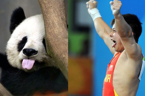 網(wǎng)友將《功夫熊貓》中大熊貓?jiān)汀皾L滾”的吐舌照與龍清泉在比賽時(shí)的調(diào)皮照放在一起,并為這名新科冠軍取名“龍滾滾”。聽說這一綽號(hào)后,龍清泉開心地笑納:“是挺像!真的!”