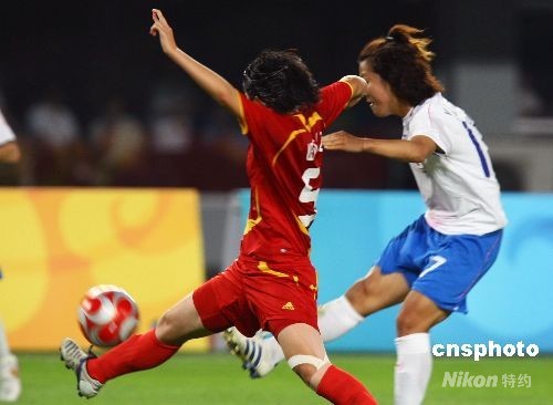 圖為中國(guó)隊(duì)5號(hào)翁新芝阻止日本隊(duì)17號(hào)長(zhǎng)鄉(xiāng)油木的進(jìn)攻。