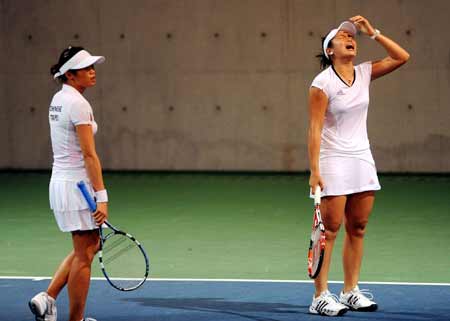 北京奧運(yùn)會(huì)13日晚間進(jìn)行女子雙打第二輪賽事,中華臺(tái)北選手莊佳容、詹詠然(右)敗給意大利選手遭淘汰。圖為在失利后,詹詠然流露出無(wú)奈的神情。(上圖)
