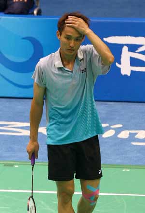 2008北京奧運(yùn)會(huì)羽毛球項(xiàng)目14繼續(xù)日在北京工業(yè)大學(xué)體育館進(jìn)行男子單打比賽,中華臺(tái)北隊(duì)選手謝裕興以2比0輸給陳金,止于八強(qiáng)。圖為謝裕興在被淘汰后再思考 (下圖)