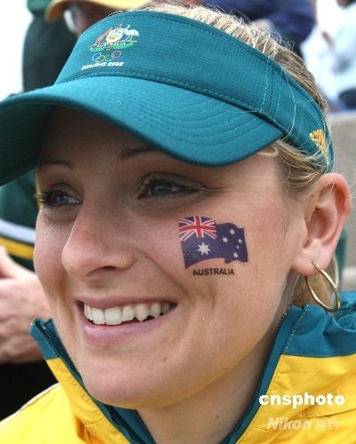 澳大利亞作為一支參賽強隊出擊當(dāng)日的比賽,澳大利亞美少女精心裝扮,到比賽現(xiàn)場為運動員助威。中新社發(fā) 趙振清 攝