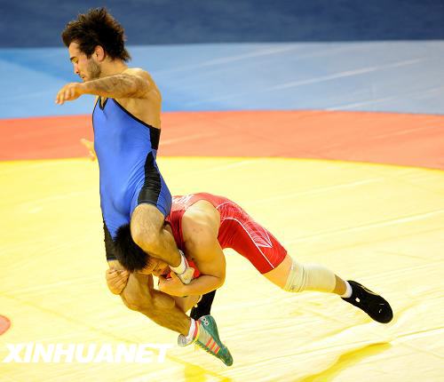 8月19日,在北京奧運(yùn)會(huì)摔跤男子自由式60公斤級(jí)1/8決賽中,前南馬其頓選手穆拉德·拉馬扎諾夫(藍(lán))戰(zhàn)勝韓國選手金鐘大。新華社記者李鋼攝