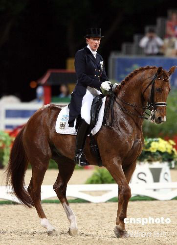 八月十九日晚,在香港沙田奧運馬術(shù)盛裝舞步個人賽(大獎賽自選動作)上,德國選手?恕た四瑺柅@銅牌。 中新社發(fā) 洪少葵 攝
