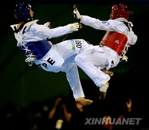 8月20日,中華臺(tái)北選手朱木炎(左)在北京奧運(yùn)會(huì)跆拳道男子58公斤級(jí)四分之一決賽中以2比3不敵多米尼加選手梅塞德斯。 新華社記者鄒崢攝