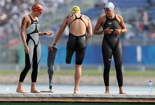 人們關(guān)注的是她的腿—左腿膝蓋以下部分被全部截去,并且比健全右腿的對(duì)稱部分細(xì)了十八厘米。在對(duì)手“如林”的長腿中,這雙殘缺的腿愈發(fā)顯得突兀。八月二十日,杜托伊特成為奧運(yùn)史上首位與健全人同場競技的女子肢殘游泳選手。
