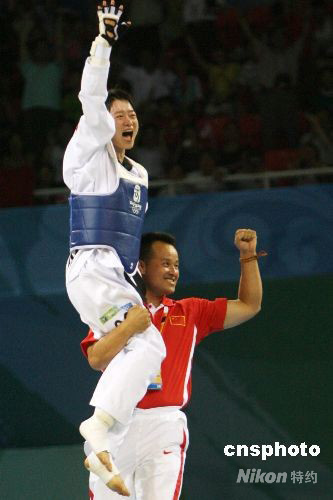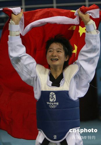 8月20日晚,21歲的中國姑娘吳靜鈺(左)在北京奧運(yùn)會(huì)跆拳道女子49公斤以下級(jí)冠亞軍決戰(zhàn)中,以1:-1戰(zhàn)勝泰國選手布特蕾·貝德蓬勇奪金牌,成為中國跆拳道在本屆奧運(yùn)會(huì)上奪得的第一枚金牌,中國體育代表團(tuán)金牌總數(shù)達(dá)到45枚。 中新社發(fā) 武仲林 攝
