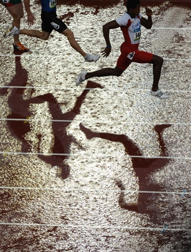 8月21號上午,在國家體育場“鳥巢”進(jìn)行的北京奧運(yùn)會田徑比賽迎來大雨,運(yùn)動(dòng)員們在雨中競技。