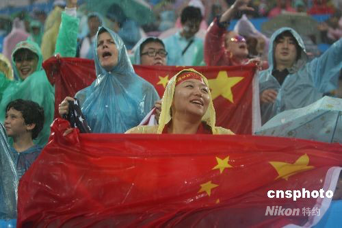 8月21日,中國選手田佳、王潔在奧運沙灘排球決賽中以0 :2負于美國選手克麗·沃爾什、米絲蒂· 梅—特雷納,獲得亞軍。圖為觀眾冒雨為運動員助威。中新社發(fā) 武仲林 攝