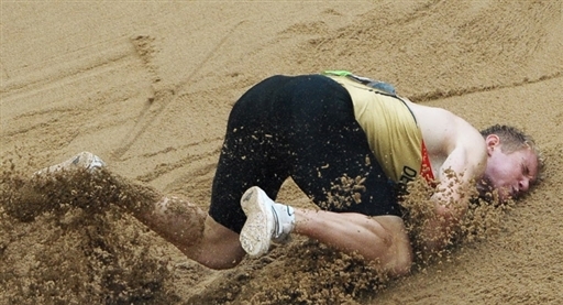 8月21日,一位選手在奧運(yùn)會(huì)男子三級(jí)跳的比賽中動(dòng)作失誤,跌落沙坑。