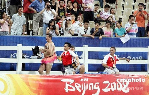 八月二十一日晚,在香港舉行的奧運馬術(shù)項目比賽進行最后一天賽事,場內(nèi)一觀眾著奇裝跑入賽場,被保安驅(qū)趕出場。中新社發(fā) 洪少葵 攝