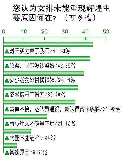 本次調(diào)查發(fā)現(xiàn),女排敗給對手,43.6%的人認(rèn)為是對手實(shí)力高于我們,42.4%的人認(rèn)為緣于我們自己急躁,沒有調(diào)整好心態(tài)。39.5%的人認(rèn)為,目前的女排缺少當(dāng)年老女排的拼搏精神。