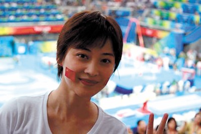 在北大體育館觀看中國女子乒乓團(tuán)體決賽的袁立,見證了中國奪取奧運(yùn)會歷史上首枚乒乓團(tuán)體金牌,不忘擺個(gè)POSE表示一下喜悅心情。