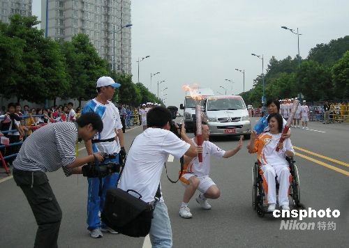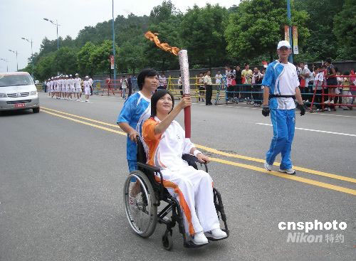 8月31日,高位癱瘓的原湖南衛(wèi)視主持人梁藝擔(dān)當(dāng)?shù)?6棒火炬手在長沙市進(jìn)行北京殘奧會(huì)火炬手傳遞。8月30日,榮獲第九屆全球熱愛生命獎(jiǎng)?wù)碌膴涞准琅核噺谋本┶s到長沙市華雅華天大酒店進(jìn)行北京殘奧會(huì)火炬手的培訓(xùn)。31日,她擔(dān)任長沙市第16棒火炬手,進(jìn)行北京殘奧會(huì)火炬?zhèn)鬟f,為北京殘奧會(huì)加油。新聞背景:梁藝原名梁瓊,1979年她出生于湖南省婁底市(下轄的漣源市)一個(gè)小學(xué)教師家庭,2001年7月,22歲的梁藝畢業(yè)于北京廣播學(xué)院播音主持藝術(shù)學(xué)院。同年加盟湖南電視臺(tái)都市頻道,主持該臺(tái)的開播晚會(huì),并任大型現(xiàn)場娛樂節(jié)目《都市有情人》和音樂節(jié)目《都市新聲代》節(jié)目主持人。中新社發(fā) 郭國權(quán) 攝