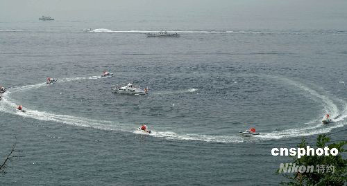圖為殘奧火炬?zhèn)鬟f經(jīng)過大連濱海路時,海上表演項目為傳遞活動增色。 中新社發(fā) 宋太盛 攝