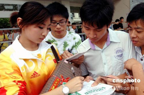 圖為被譽為中國最美奧運冠軍的何雯娜為眾多大學生“粉絲”簽名。 中新社發(fā) 劉可耕 攝