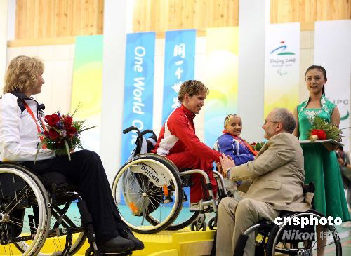 9月7日上午,北京2008殘奧會射擊R2級女子10米氣步槍立射-SH1項目的決賽中,斯洛伐克選手韋羅妮卡·瓦多維喬娃摘得北京殘奧會上的第一枚金牌。銀牌得主為德國選手曼努埃拉·施默蒙德;波多黎各選手妮爾達·戈麥斯·洛佩茲獲得銅牌。圖為國際殘奧會主席菲利普·克雷文為獲獎運動員頒獎。中新社發(fā) 宋吉河 攝