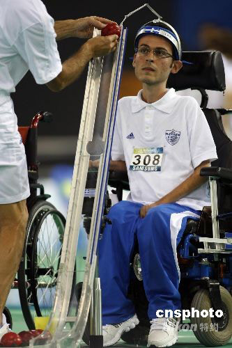 9月7日,北京殘奧會(huì)硬地滾球比賽,中國(guó)選手朱賀僑在混合單打BC3級(jí)別小組賽中以1比11不敵希臘選手格里戈里奧斯。中新社發(fā) 杜洋 攝