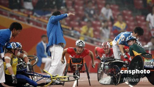 9月8日晚,北京殘奧會(huì)田徑比賽女子5000米T54級(jí)決賽在北京國(guó)家體育場(chǎng)“鳥(niǎo)巢”進(jìn)行,選手們?cè)诒荣愔邢嘧驳沟。加拿大選手羅伊以11分54秒03的成績(jī)奪冠。圖為加拿大選手羅伊沖出“重圍”。中新社發(fā) 盛佳鵬 攝