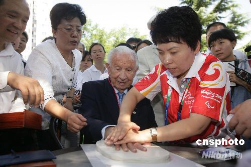 9月11日,國際奧組委名譽(yù)主席薩馬蘭奇和鄧亞萍走進(jìn)了東四奧林匹克社區(qū)。薩馬蘭奇為東四奧林匹克社區(qū)的顧拜旦、薩馬蘭奇、羅格的雕塑剪彩并為東四奧林匹克社區(qū)博物館題字、印手模,隨后參觀了東四奧林匹克社區(qū)公園。圖為鄧亞萍幫助薩馬蘭奇為北京東四奧林匹克社區(qū)博物館印手模。 中新社發(fā) 郝飛 攝