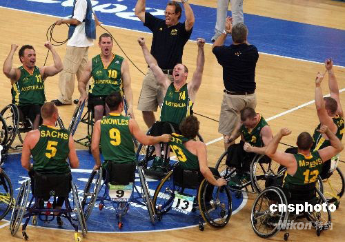 圖為澳大利亞隊(duì)?wèi)c祝獲北京殘奧會(huì)輪椅男籃冠軍。