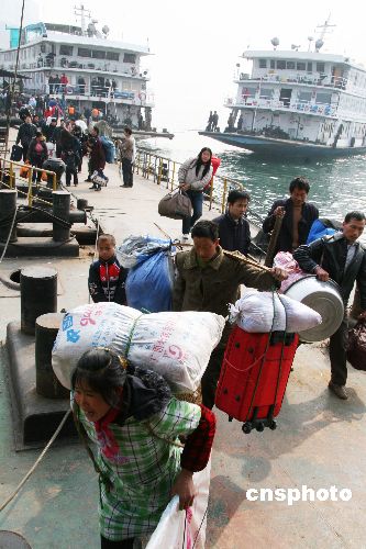 返鄉(xiāng)過節(jié)的三峽庫區(qū)民工在重慶市云陽縣港務站碼頭下船。最近幾天來,三峽庫沿線各港口碼頭開始熱鬧起來,從上海、廣東、江蘇等地務工的外出民工陸續(xù)啟程回家過春節(jié),形成三峽水路旅客高峰。中新社發(fā) 饒國君 攝