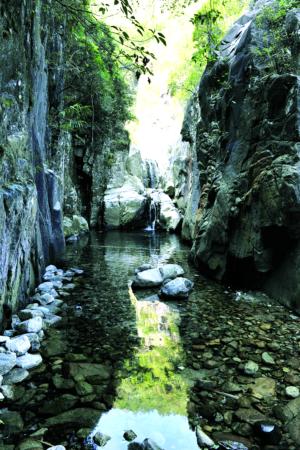 沿著黃巢山盤(pán)旋而上,到半山時(shí)下車(chē),順山腰行20分鐘,就進(jìn)到峽谷。谷底是滿眼美麗的鵝卵石———這是峽谷下游的河床,溪水蜿蜒數(shù)公里,再匯入晉江。冬季水枯,光溜溜的鵝卵石,密布河床。潺潺溪水,沖出圈圈水紋,太陽(yáng)映在潭底,光影動(dòng)人。