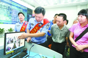 居民們對(duì)指揮中心的大屏幕倍感興趣,兩位東城“110”民警形象大使向他們演示了指揮中心如何通過系統(tǒng)指揮“110”警車到達(dá)現(xiàn)場接處警!懊刻炀榉譃4級(jí),3級(jí)以上的警情,指揮中心可在第一時(shí)間直接指揮調(diào)動(dòng)警車,通過GPS定位,指揮最近的巡邏車組去現(xiàn)場,然后再通過探頭查看現(xiàn)場,確保3級(jí)以上警情,警車5分鐘就能到達(dá)現(xiàn)場!毙蜗蟠笫垢稄(qiáng)警官介紹。