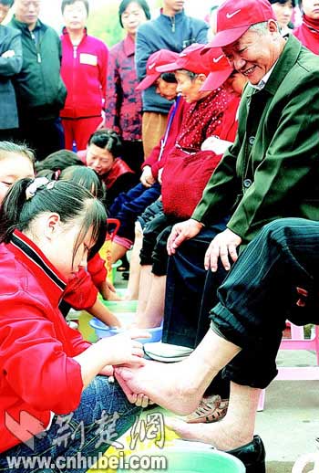 襄樊市委副書(shū)記萬(wàn)桃元得知孫穩(wěn)、李聯(lián)德兩位百歲老人也到了現(xiàn)場(chǎng),忙迎上前為他們送去祝福。隨后,兩名志愿者來(lái)到兩位老人身前為其洗腳。其中一位志愿者名叫汪光房,今年51歲,是襄陽(yáng)區(qū)文聯(lián)的退休職工。他告訴記者:“敬老愛(ài)老是中國(guó)的傳統(tǒng)美德,每個(gè)人都應(yīng)該真心行孝,感恩老輩!