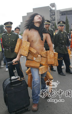 又是他!繼今年5月1日在南屏步行街以全身貼滿人民幣的形式進行了一場名為“金錢加權(quán)力等于一切嗎”的行為藝術(shù)后,云南藝術(shù)學院03級油畫班畢業(yè)生王軍昨天背負磚頭行走兩個多小時,用他覺得最棒的方式說一聲:“昆明,我走了!