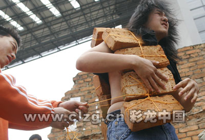見已經(jīng)無法前進,王軍沮喪地和朋友抱在一起,取消了穿過校園的計劃。由于有些不堪重負,再次出發(fā)后,他僅在脖子上掛上一塊磚。