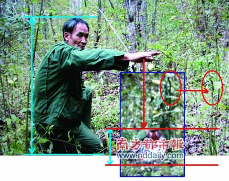 11月4日,本報(bào)(注:南方都市報(bào))記者以普通網(wǎng)友的身份隨手發(fā)布了一張周正龍重回現(xiàn)場(chǎng)的圖片,沒(méi)想到引起了網(wǎng)友的極大興趣,甚至一些網(wǎng)友拿這張圖片與之前的系列虎照對(duì)比,從其中標(biāo)志性植物枝葉的大小高低和位置關(guān)系得出了老虎只有貓大的猜測(cè),認(rèn)定這就是“周老虎”作假的終極鐵證。但也有網(wǎng)友表示反對(duì),認(rèn)為無(wú)法確定老虎與標(biāo)志性枝葉的關(guān)系。