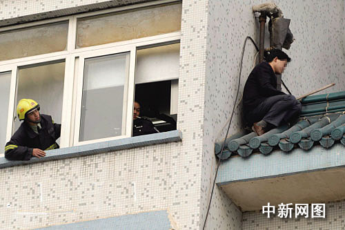 欲跳樓的男子手持一根一米長(zhǎng)的帶釘木棍,半蹲半坐地倚在四樓樓頂?shù)墓战翘,他不斷揮舞著木棍防止他人靠近。在二樓的平臺(tái)上,派出所民警嚴(yán)陣以待,隨時(shí)準(zhǔn)備處置突發(fā)事件。四樓樓頂,艱難的談判正在進(jìn)行,衛(wèi)生部門(mén)的一位負(fù)責(zé)人與男子不停地交流著,此時(shí)男子的情緒相對(duì)穩(wěn)定,但只要看到民警靠近,男子就會(huì)立刻警覺(jué),并將身子向樓頂邊緣靠去。