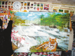 記者隨即趕到這家商店。店里的伙計從倉庫里面搬出50張已經(jīng)落了灰塵的一卷年畫。展開一看,全部是一模一樣的《老虎臥瀑圖》。上面均印有“鑫龍墻畫”的商標(biāo)和“TQ8301”的編碼。