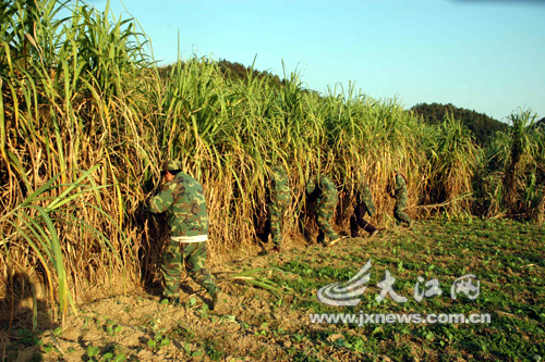 昨日下午3時許,由數(shù)十名德興市武警戰(zhàn)士、上饒市特警、德興公安民警以及民兵等人員組成的搜捕隊再一次來到付家墩,他們對付家墩村村后的百畝甘蔗進行了全面搜查。