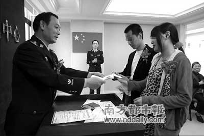 “我以后一定改過(guò)自新,好好對(duì)我老婆”,小兩口一臉幸福,一旁的袁奶奶也不住地抹眼淚,由看守所所長(zhǎng)證婚,從制定安全警戒措施、準(zhǔn)備蛋糕糖果到布置婚禮現(xiàn)場(chǎng)都由看守所民警一手張羅,才上演了11月21日中山市婚姻登記中心那溫馨的一刻。 (記者 陳崢 通訊員 鄧麗霞 何劍文攝)