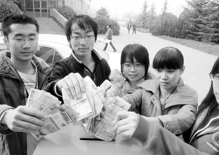 11月30日上午,西北工業(yè)大學(xué)明德學(xué)院的廣播里開始播放《陽光報(bào)》和西安騰訊網(wǎng)關(guān)于孔靜救母的報(bào)道,去飯?zhí)贸燥埖膶W(xué)生走到募捐處排起長隊(duì)捐錢,100元、50元、10元、2元,校友們紛紛將節(jié)省下來的錢投到募捐箱里,。一名大一女生抹著眼淚說:“一個剛畢業(yè)的大學(xué)生,遇到這種事情也太難了,每天少吃一個菜,也要為孔靜姐姐捐些錢!30日下午,馬老師等人帶著全校師生的捐款14183.4元,送到了交大一附院的病房,孔靜不住地擦眼淚。