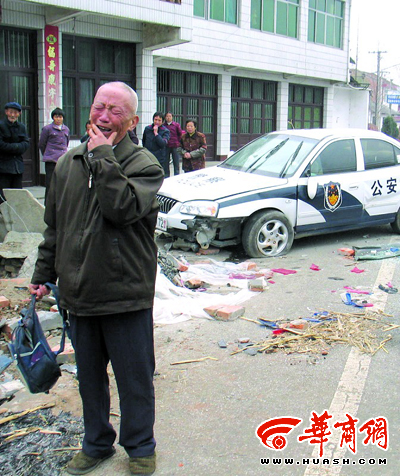 濤濤的雙親常年在外務(wù)工,他一直和爺爺奶奶生活,每天放學(xué)后爺爺都會去路上接他。12月3日下午3時許,王興舉老人朝孫子回家的方向趕去時,一輛警車從316國道由西向東駛過,汽車駛出幾十米后突然斜著沖到對面車道,并撞在馬路旁的花壇上!疤膳铝!”當(dāng)時正在馬路對面的村民王新強說:“警車撞到花壇后便一連側(cè)翻了3個跟頭,才落在約十余米以外的路邊。”這時,他才發(fā)現(xiàn)背著書包沿馬路邊回家的濤濤已倒在血泊里。