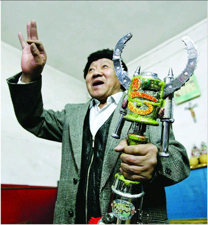看看這東西,您知道它是干什么用的嗎?這是一件“武器”,是鄭州市民78歲老漢胡國(guó)平的新“發(fā)明”,他說(shuō),這件“武器”威力可不小,它集10種功能于一身,可分上下左右前后多方位攻擊敵人,也能釋放辣椒水噴射敵眼,可攻可守,如能推廣,將是民警與巡防隊(duì)員制敵防身的有力武器。